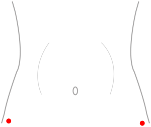 - 腸骨上縁で側部より下方へ5横指(指幅5本分)程向かった所にあるツボになります。まず股関節の前側で、骨盤の骨が一番出ている場所(腸骨前上棘)を触ります。そしてもうひとつ、その場所より中指の長さ程度下のあたりで、脚の外側にある骨の出ている部分(大転子)を見つけます。この二つの点を結んだ中間点にあります。腰骨の前端を少し下がったあたり、左右両側にあります。
